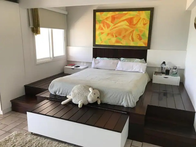 – 01 Suíte master com uma cama queen com ar-condicionado split, banheira e acesso a sacada com vista para o mar