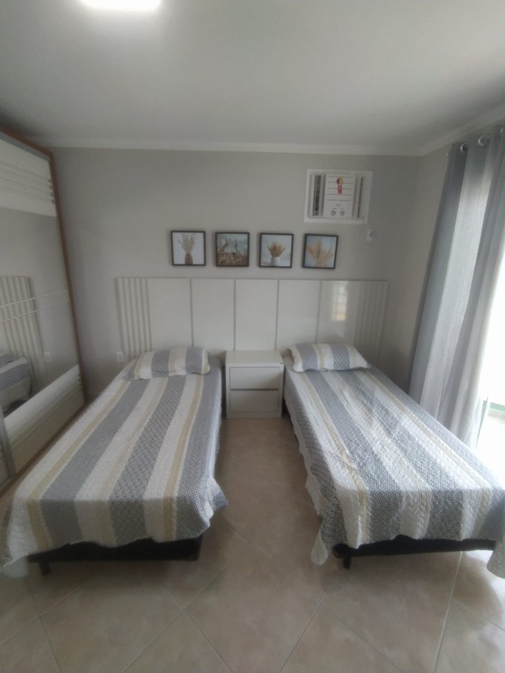 – 01 Suíte com duas camas box de solteiro, um colchão extra de casal, sacada e ar-condicionado janela